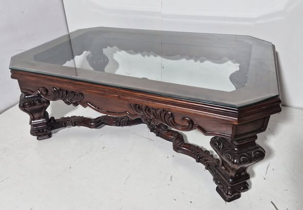 MESA CENTRO TAP.CRISTAL (117X77) (47CM ALTO) (TALLADA) (NOGAL OSC)