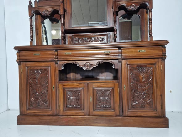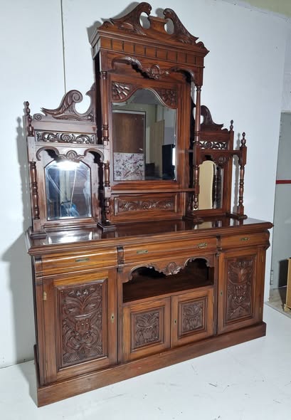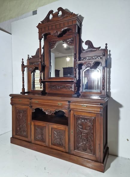 MUEBLE APARADOR 4P 3C + ALTO ESPEJO (185X52X255) (TALLADO) (NOGAL OSC)